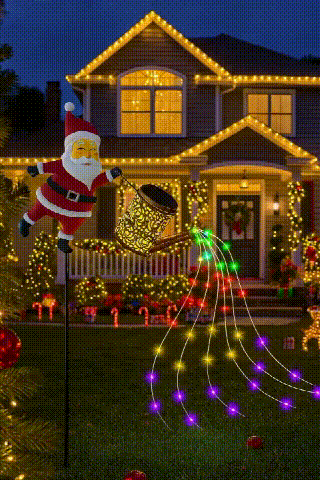 Watch as Santa joyfully “pours” glowing streams of colorful lights into your garden or yard — a charming outdoor decoration that blends holiday spirit with warm illumination.